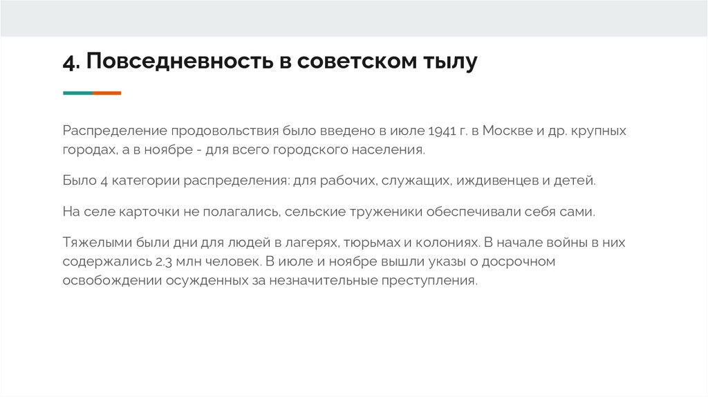 4. Повседневность в советском тылуРаспределение продовольствия было введено в июле 1941 г. в Москве и др. крупных