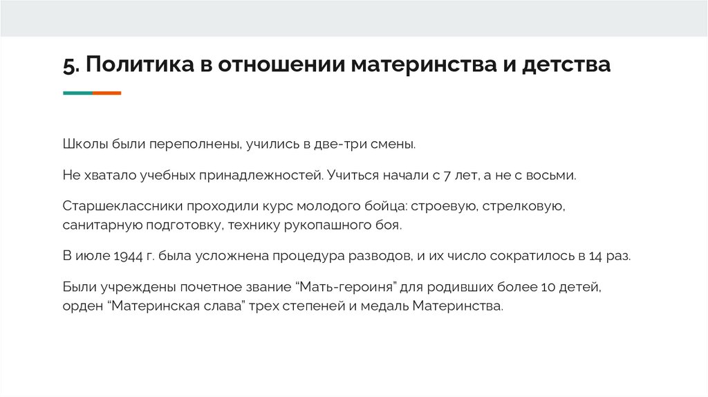 5. Политика в отношении материнства и детстваШколы были переполнены, учились в две-три смены.
