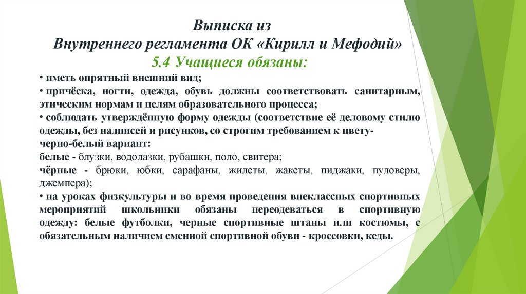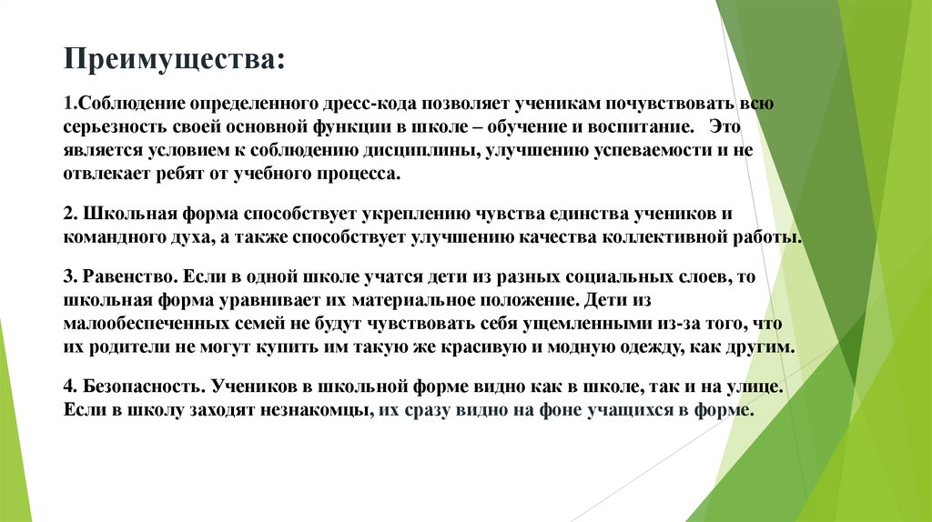 Преимущества:1.Соблюдение определенного дресс-кода позволяет ученикам почувствовать всю