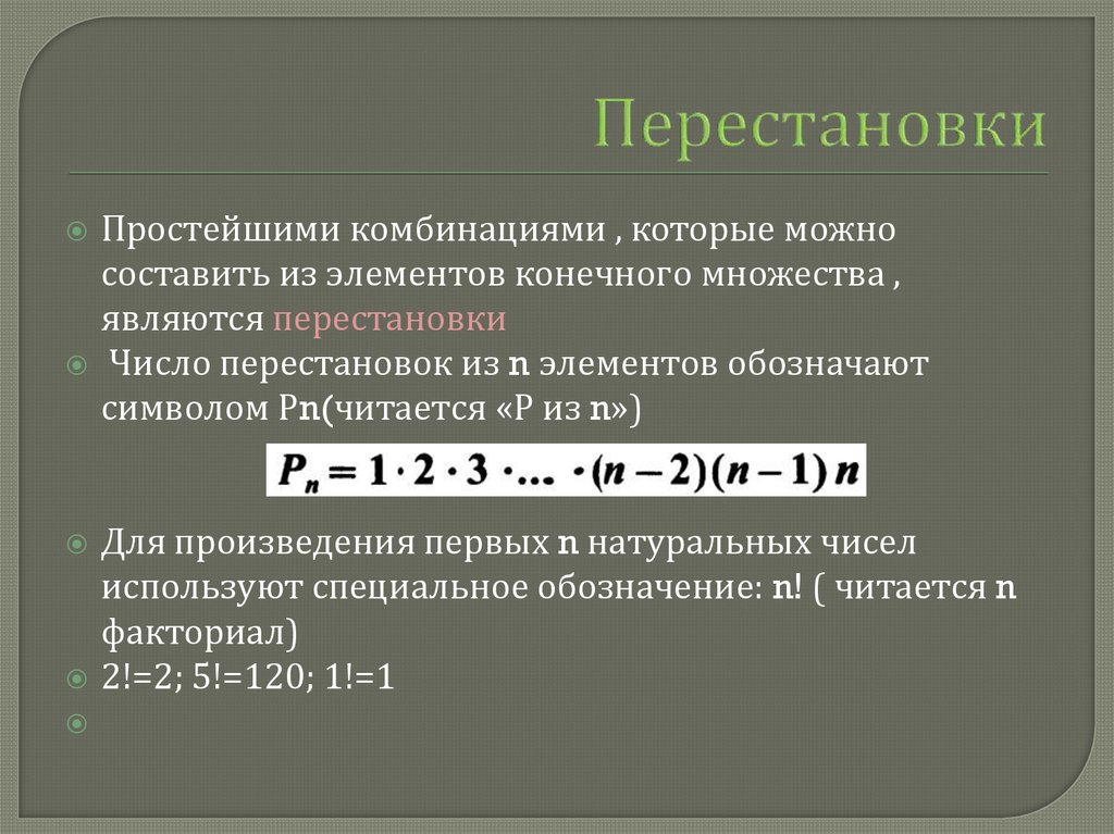 Таким образом , число всевозможных перестановок изn элементов вычисляется по формуле: Рn=n!