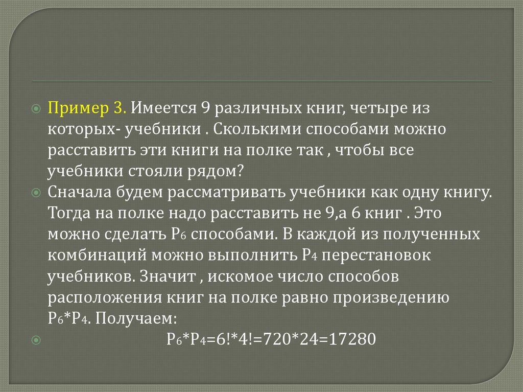 Пример 3. Имеется 9 различных книг, четыре изкоторых- учебники . Сколькими способами можно