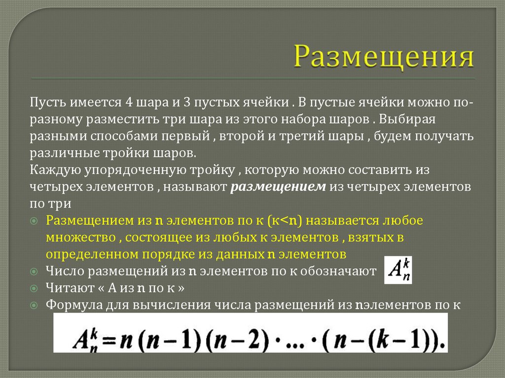 Пусть имеется 4 шара и 3 пустых ячейки . В пустые ячейки можно поразному разместить три шара из этого набора шаров . Выбираяразными способами первый , второй и третий шары , будем получать