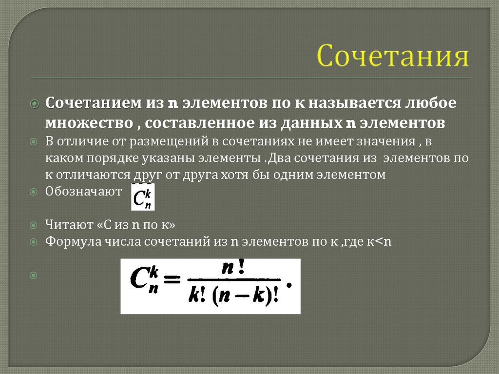 Сочетанием из n элементов по к называется любоемножество , составленное из данных n элементов