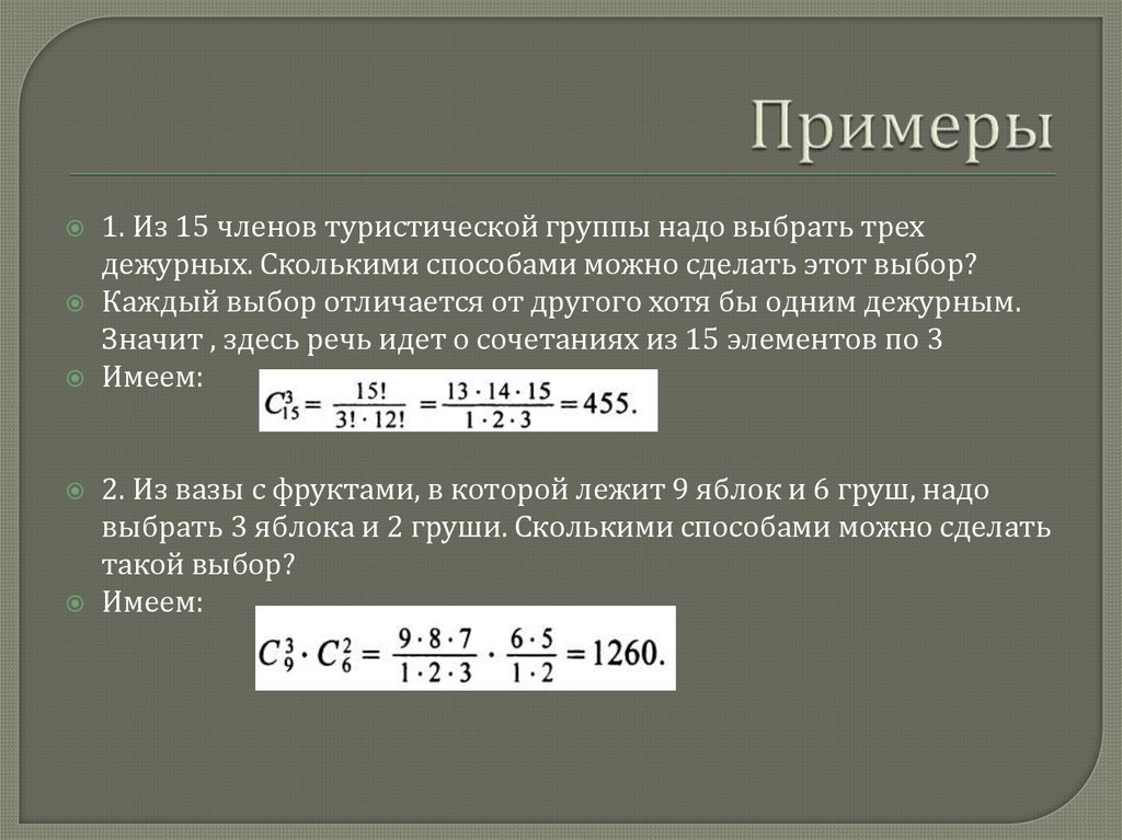 1. Из 15 членов туристической группы надо выбрать трехдежурных. Сколькими способами можно сделать этот выбор?
