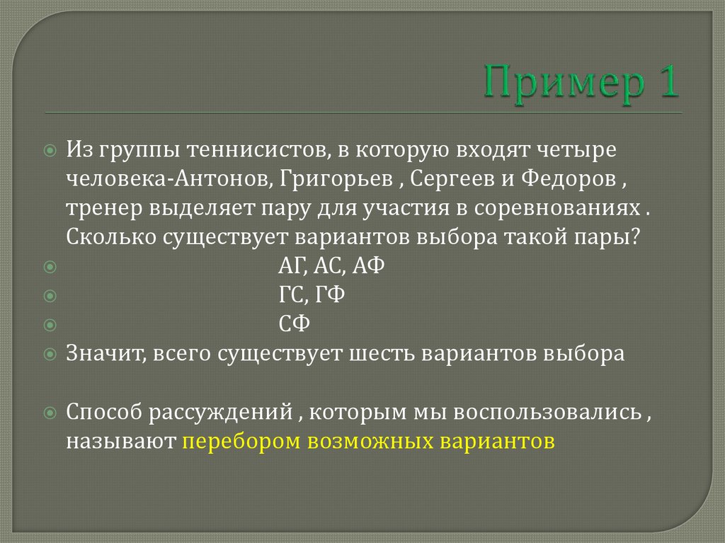 Из группы теннисистов, в которую входят четыречеловека-Антонов, Григорьев , Сергеев и Федоров ,