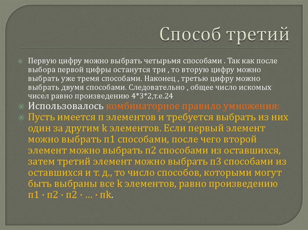 выбрать уже тремя способами. Наконец , третью цифру можно