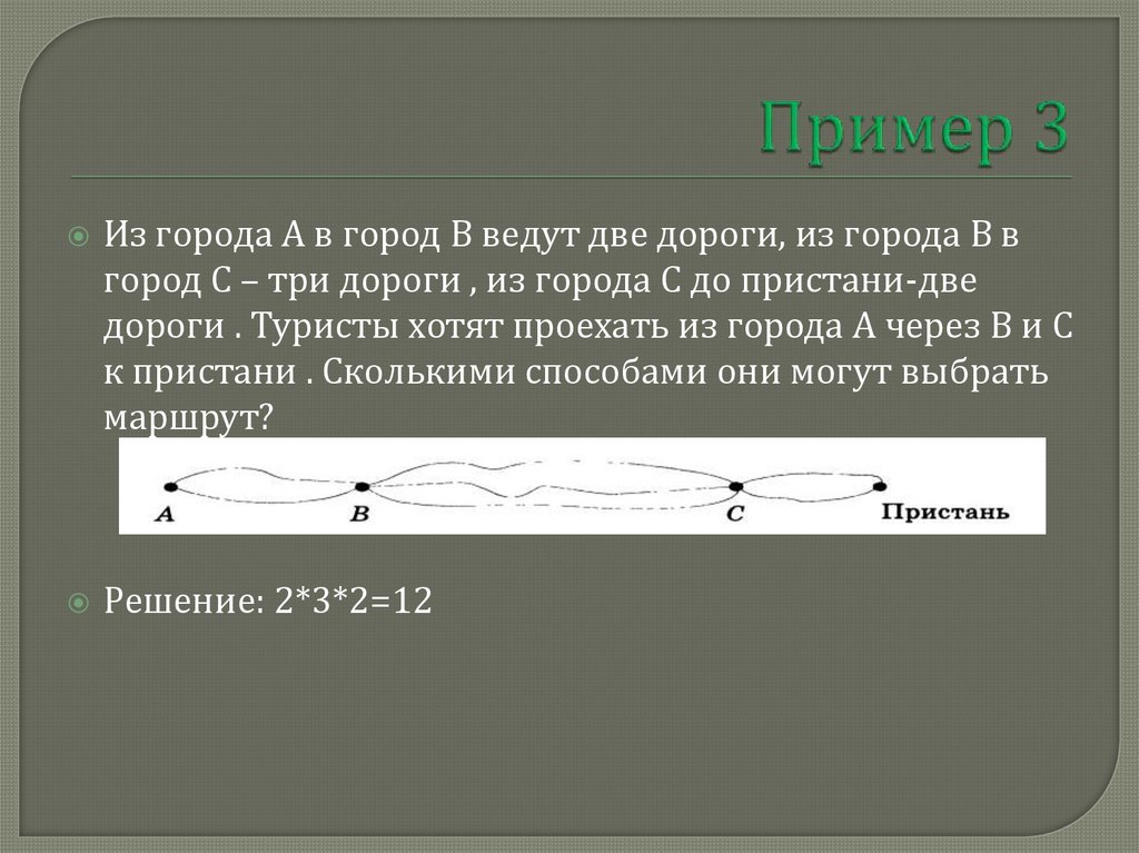Из города А в город В ведут две дороги, из города В вгород С – три дороги , из города С до пристани-две