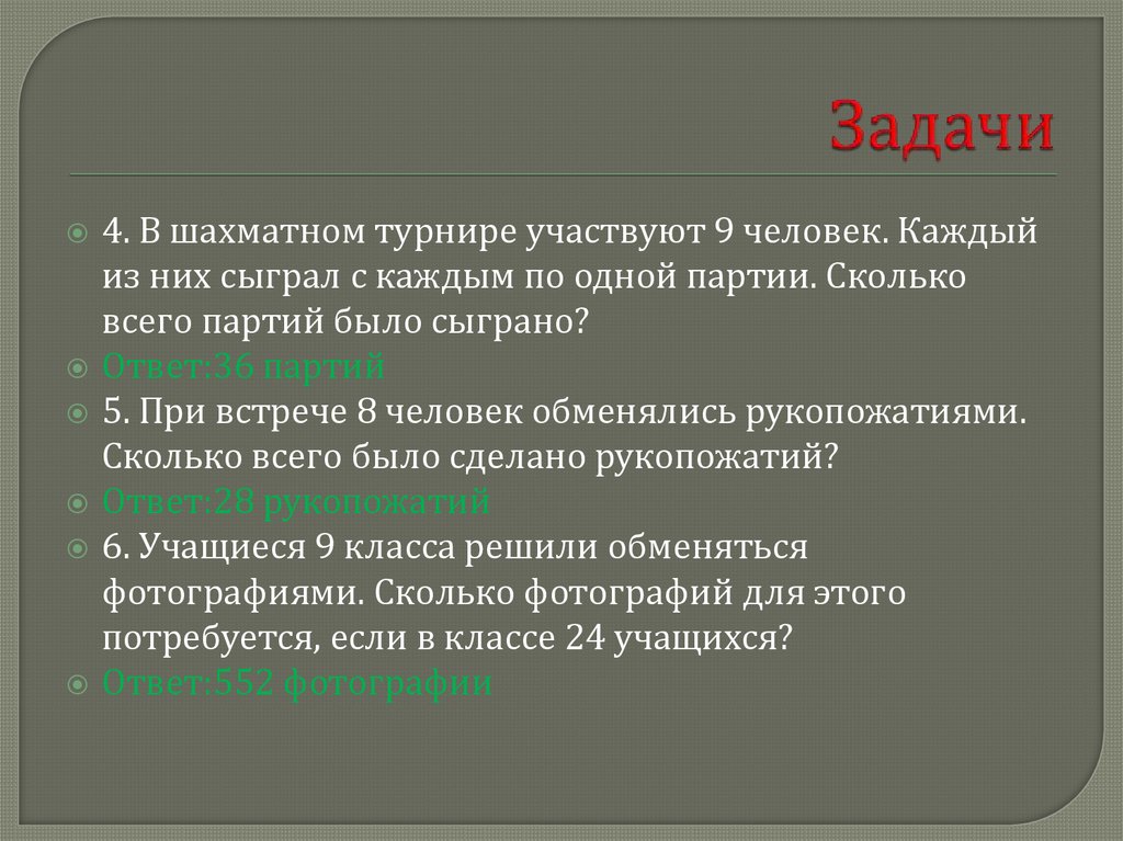 4. В шахматном турнире участвуют 9 человек. Каждыйиз них сыграл с каждым по одной партии. Сколько
