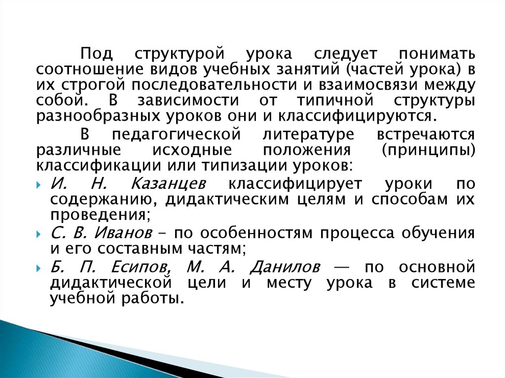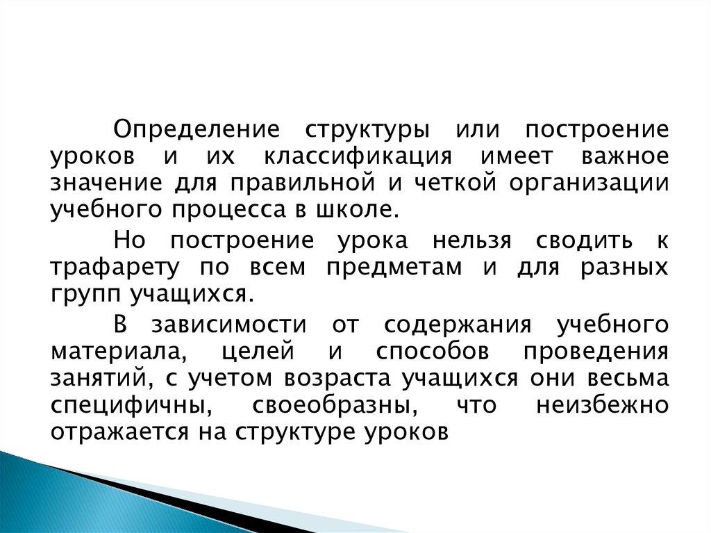 Под структурой урока следует пониматьсоотношение видов учебных занятий (частей урока) в