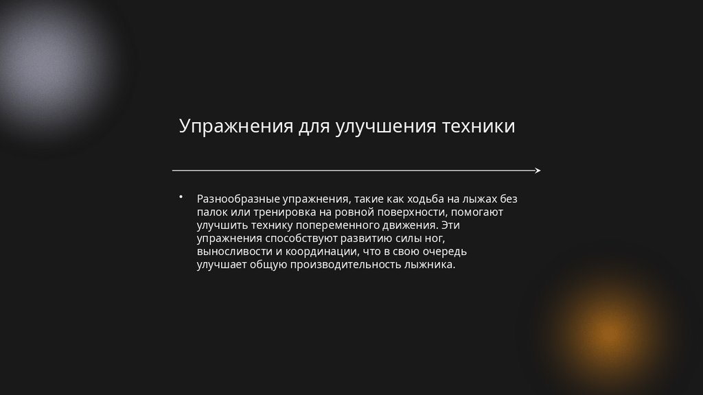 Упражнения для улучшения техникиРазнообразные упражнения, такие как ходьба на лыжах без