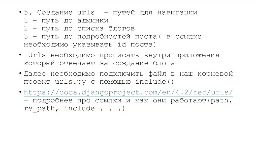 • 5. Создание urls - путей для навигации1 – путь до админки