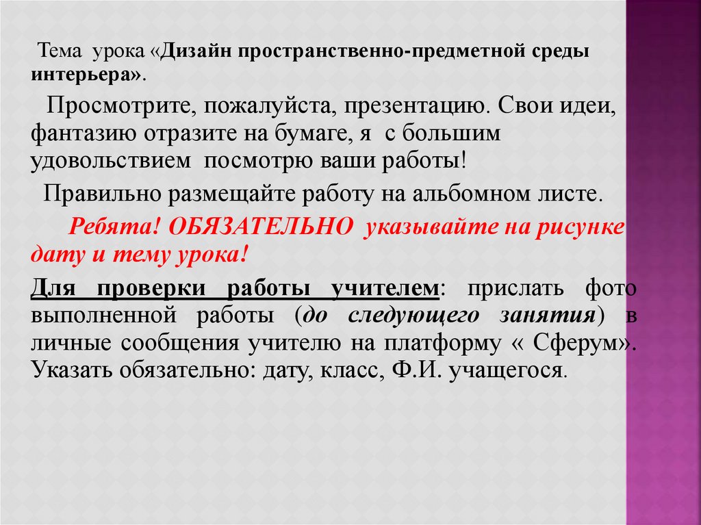Тема урока «Дизайн пространственно-предметной средыинтерьера».