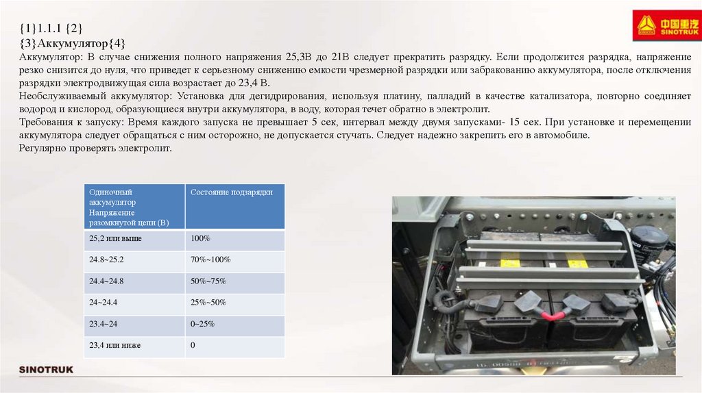Аккумулятор: В случае снижения полного напряжения 25,3В до 21В следует прекратить разрядку. Если продолжится разрядка, напряжение