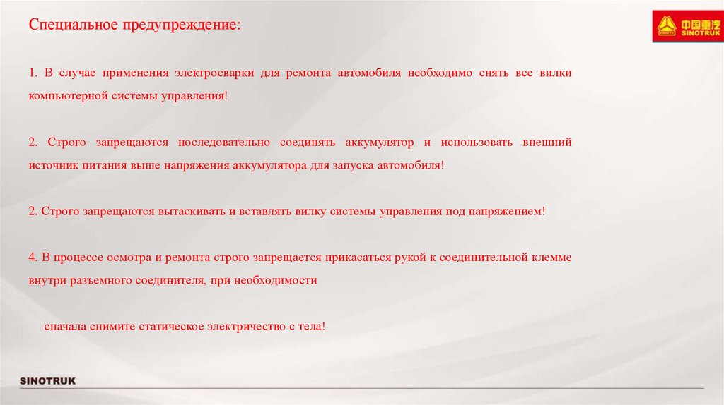 Специальное предупреждение:1. В случае применения электросварки для ремонта автомобиля необходимо снять все вилки