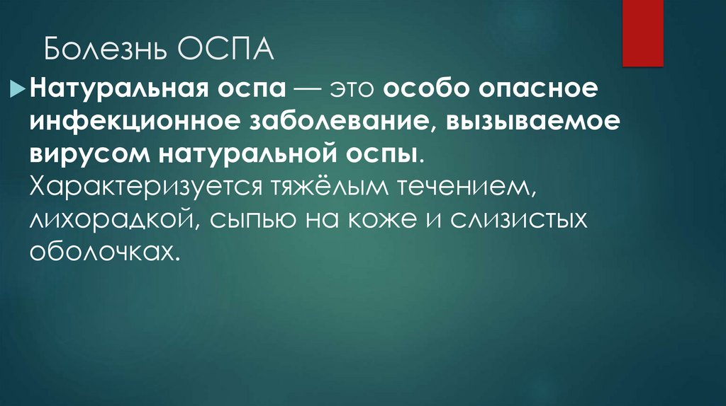 Болезнь ОСПАНатуральная оспа — это особо опасное