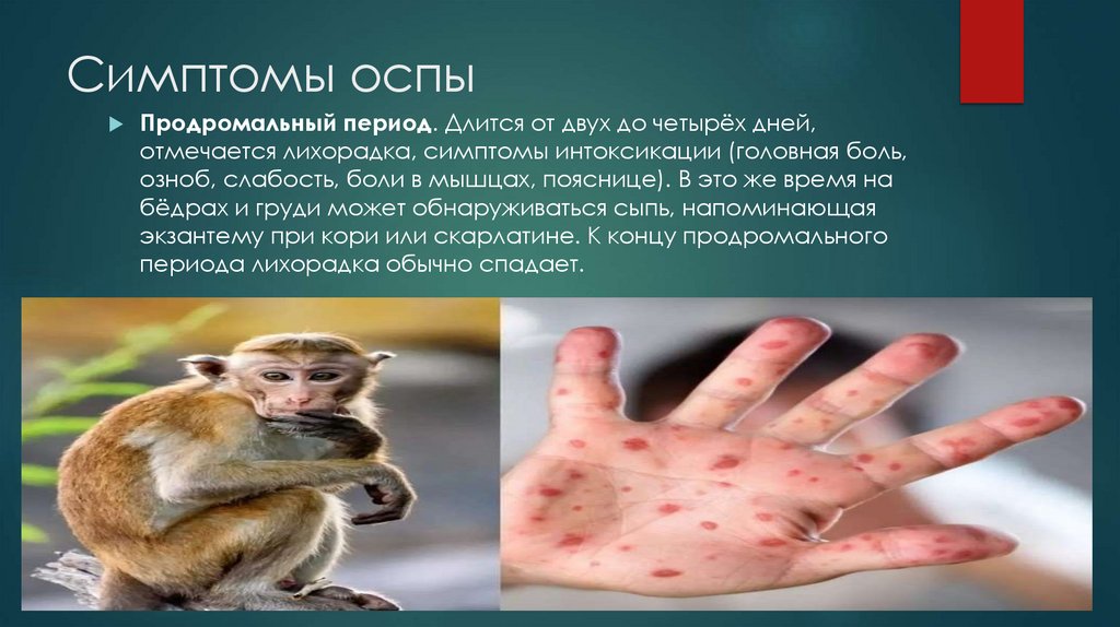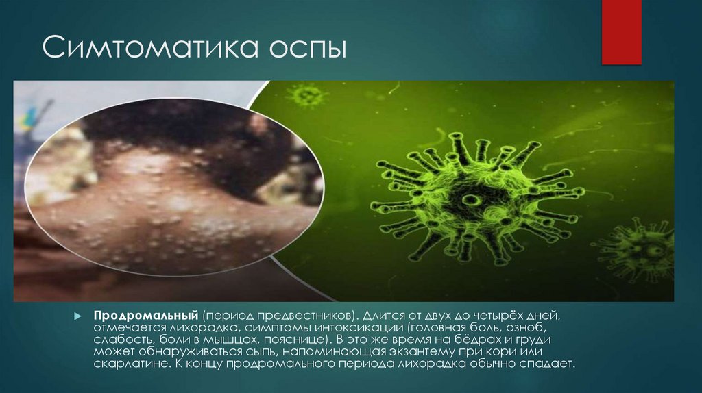 Симптомы оспыПродромальный период. Длится от двух до четырёх дней,
