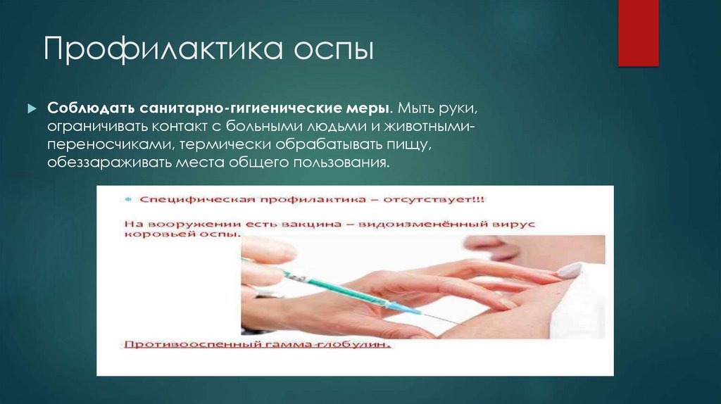 Профилактика оспыСоблюдать санитарно-гигиенические меры. Мыть руки,