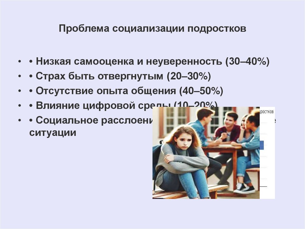 Проблема социализации подростков• Низкая самооценка и неуверенность (30–40%)
