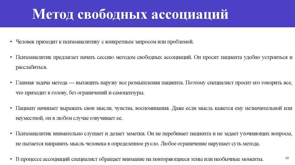 Метод свободных ассоциаций• Человек приходит к психоаналитику с конкретным запросом или проблемой.