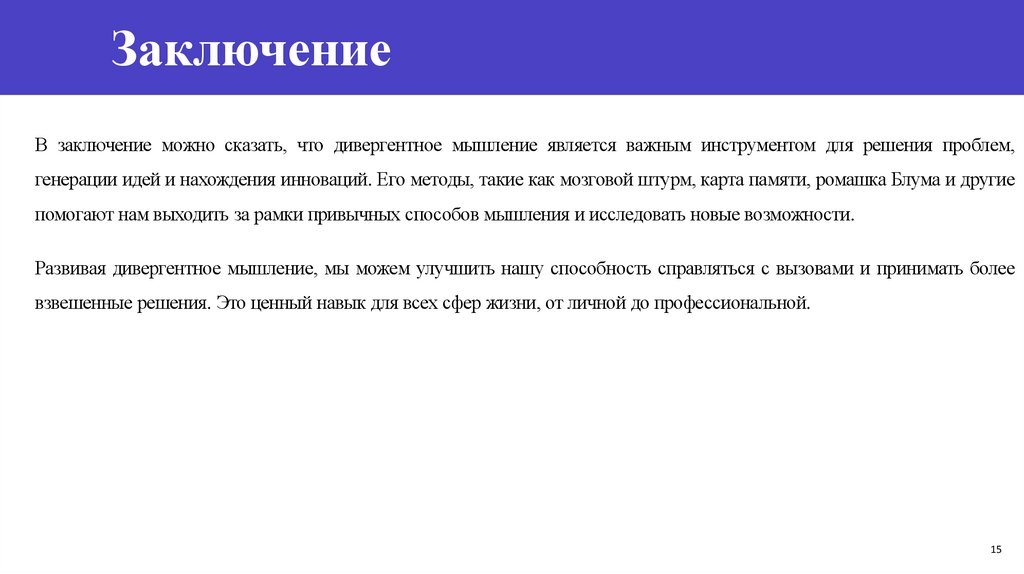 ЗаключениеВ заключение можно сказать, что дивергентное мышление является важным инструментом для решения проблем,