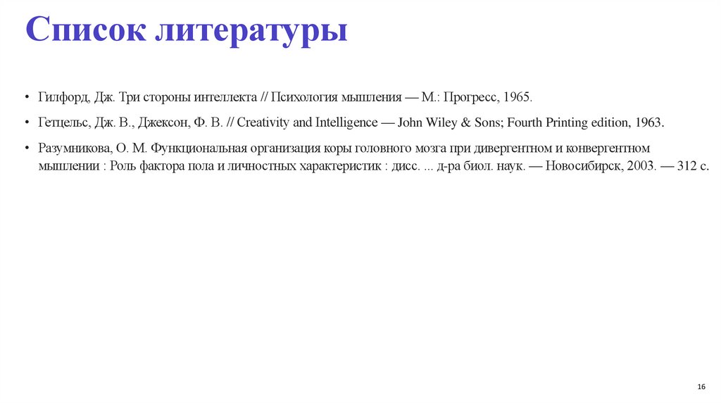 Список литературы• Гилфорд, Дж. Три стороны интеллекта // Психология мышления — М.: Прогресс, 1965.