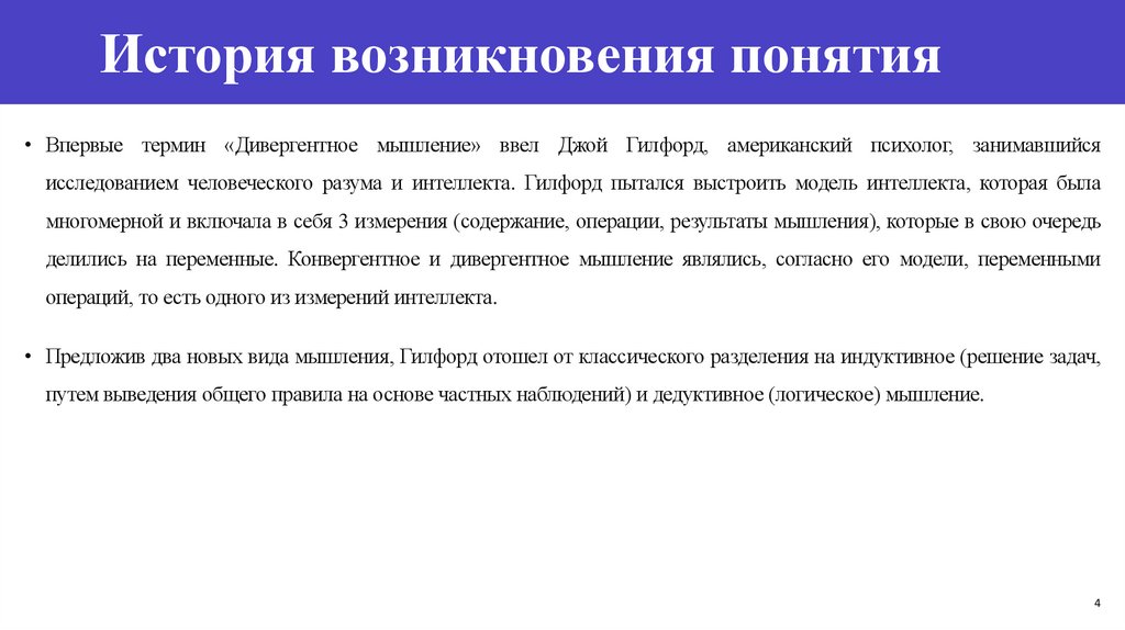 История возникновения понятия• Впервые термин «Дивергентное мышление» ввел Джой Гилфорд, американский психолог, занимавшийся