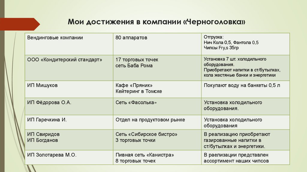 Мои достижения в компании «Черноголовка»Вендинговые компании
