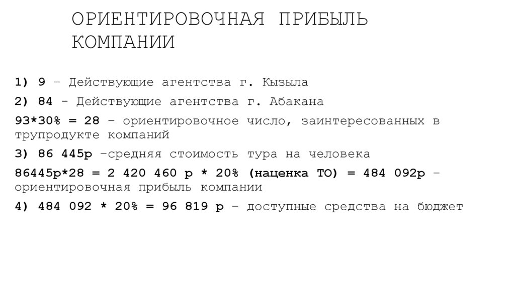 ОРИЕНТИРОВОЧНАЯ ПРИБЫЛЬКОМПАНИИ