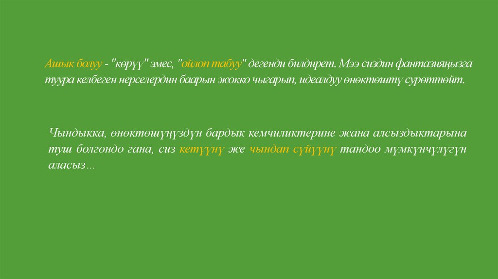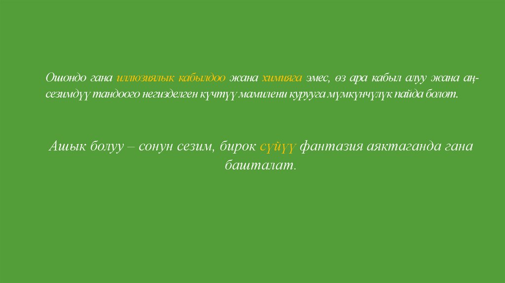 Ошондо гана иллюзиялык кабылдоо жана химияга эмес, өз ара кабыл алуу жана аңсезимдүү тандоого негизделген күчтүү мамилени курууга мүмкүнчүлүк пайда болот.Ашык болуу – сонун сезим, бирок сүйүү фантазия аяктаганда гана