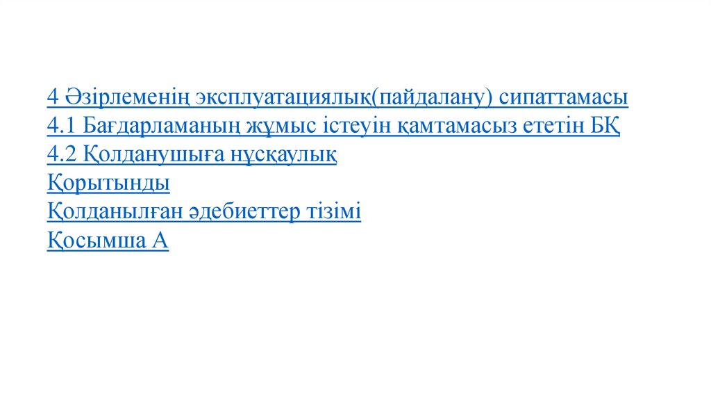 4 Әзірлеменің эксплуатациялық(пайдалану) сипаттамасы4.1 Бағдарламаның жұмыс істеуін қамтамасыз ететін БҚ