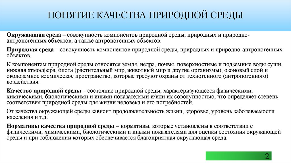 ПОНЯТИЕ КАЧЕСТВА ПРИРОДНОЙ СРЕДЫОкружающая среда – совокупность компонентов природной среды, природных и природноантропогенных объектов, а также антропогенных объектов.