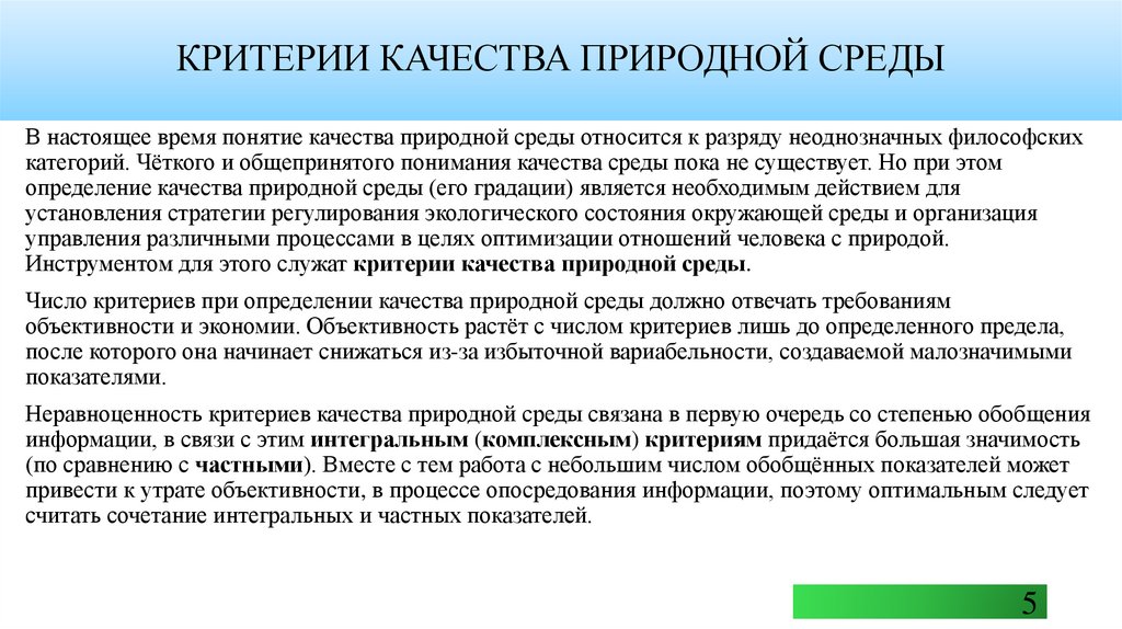 КРИТЕРИИ КАЧЕСТВА ПРИРОДНОЙ СРЕДЫВ настоящее время понятие качества природной среды относится к разряду неоднозначных философских