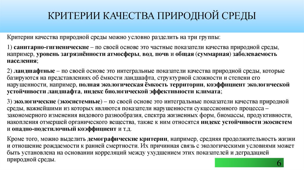 КРИТЕРИИ КАЧЕСТВА ПРИРОДНОЙ СРЕДЫКритерии качества природной среды можно условно разделить на три группы: