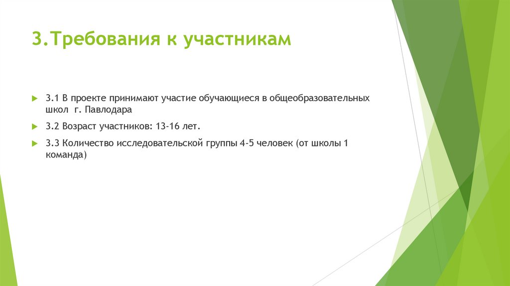 3.Требования к участникам3.1 В проекте принимают участие обучающиеся в общеобразовательных