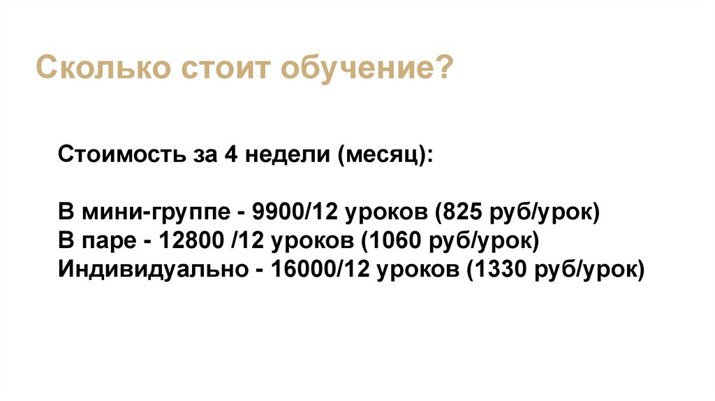 Сколько стоит обучение?Стоимость за 4 недели (месяц):
