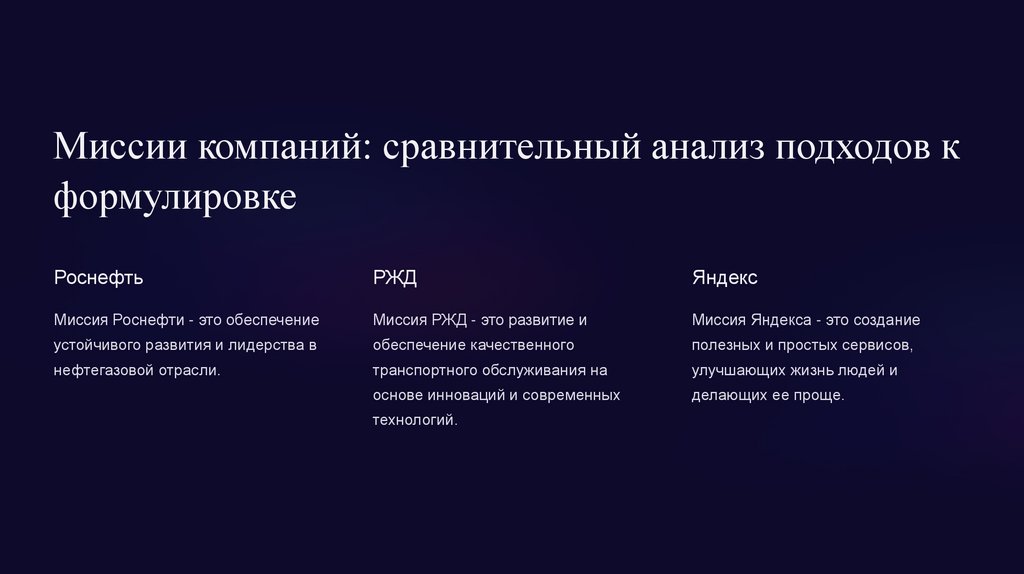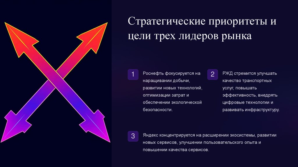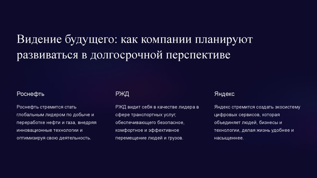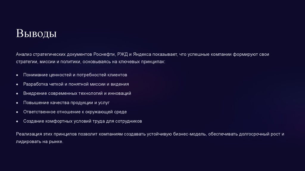 ВыводыАнализ стратегических документов Роснефти, РЖД и Яндекса показывает, что успешные компании формируют свои