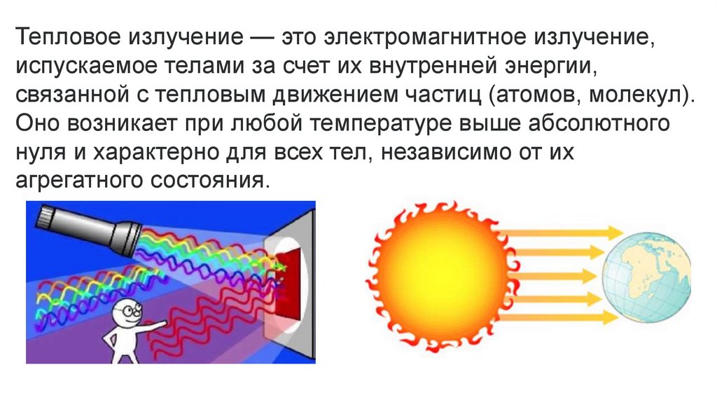 Тепловое излучение — это электромагнитное излучение,испускаемое телами за счет их внутренней энергии,