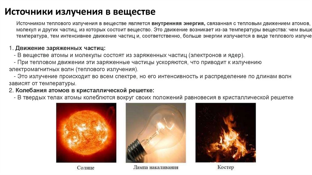 Источники излучения в веществеИсточником теплового излучения в веществе является внутренняя энергия, связанная с тепловым движением атомов,