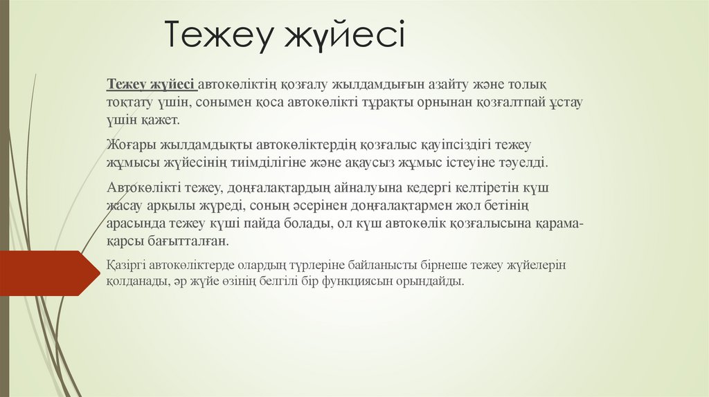 Тежеу жүйесіТежеу жүйесі автокөліктің қозғалу жылдамдығын азайту және толық