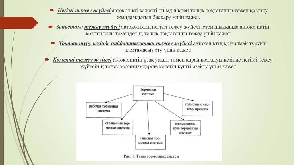 қозғалысын төмендетіп, толық тоқтағанша тежеу үшін қажет.
