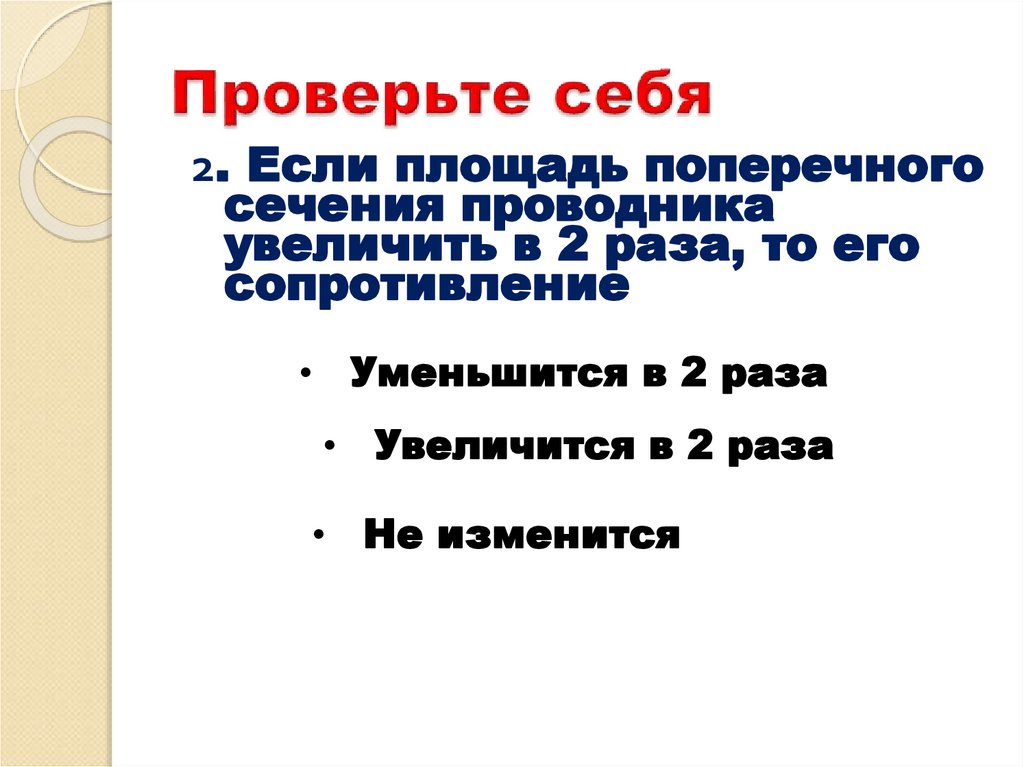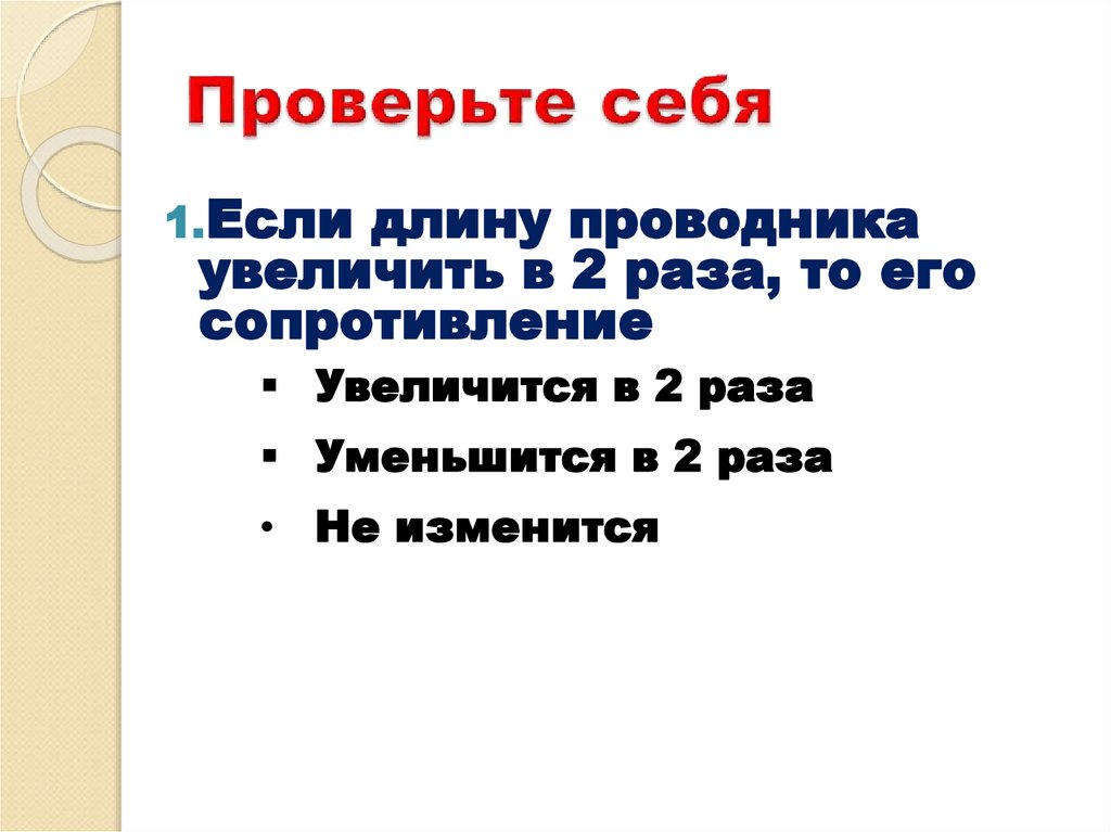 1.Если длину проводникаувеличить в 2 раза, то его
