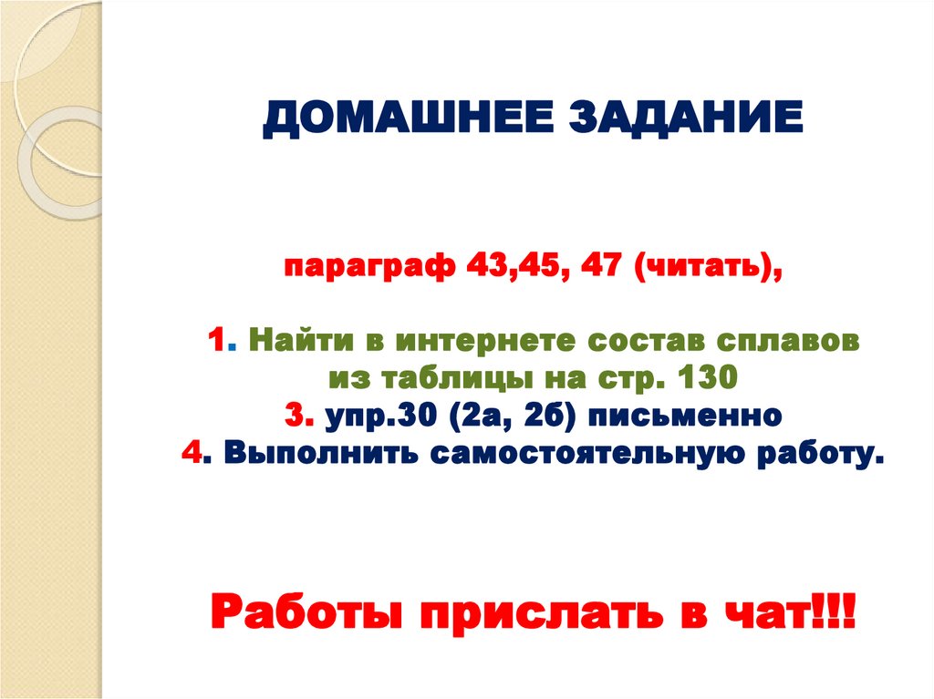 17. ДОМАШНЕЕ ЗАДАНИЕ параграф 43,45, 47 (читать), 1. Найти в интернете состав сплавов из таблицы на стр. 130 3. упр.30 (2а, 2б)