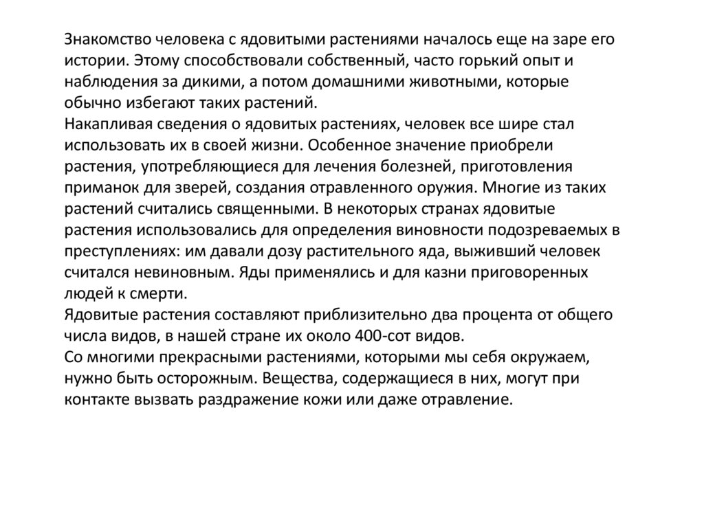 Знакомство человека с ядовитыми растениями началось еще на заре егоистории. Этому способствовали собственный, часто горький опыт и