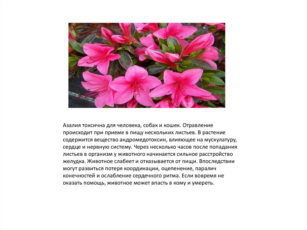 Азалия токсична для человека, собак и кошек. Отравлениепроисходит при приеме в пищу нескольких листьев. В растение