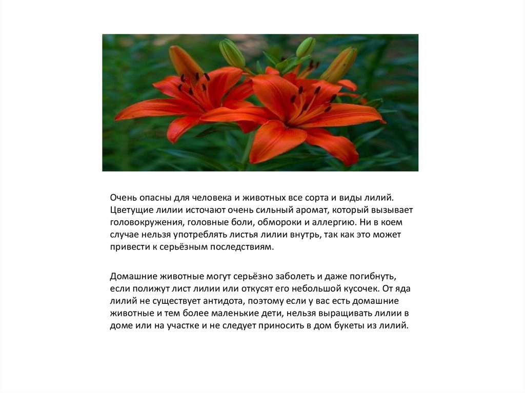 Очень опасны для человека и животных все сорта и виды лилий.Цветущие лилии источают очень сильный аромат, который вызывает