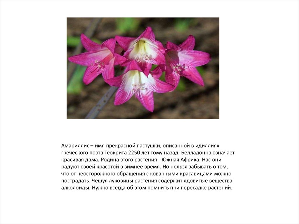 Амариллис – имя прекрасной пастушки, описанной в идиллияхгреческого поэта Теокрита 2250 лет тому назад. Белладонна означает