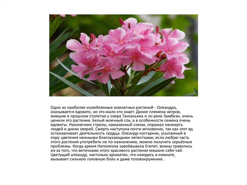 Одно из наиболее излюбленных комнатных растений - Олеандра,оказывается ядовито, но это мало кто знает. Дикие племена негров,
