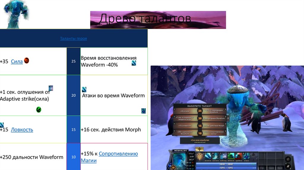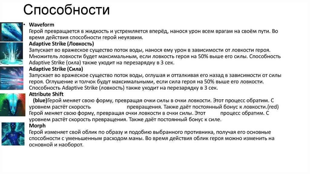 которого является Ловкость. Первая способность, растворяет Morphling и