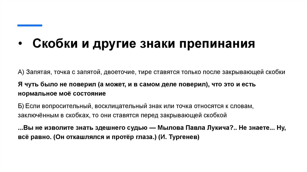 • Скобки и другие знаки препинанияА) Запятая, точка с запятой, двоеточие, тире ставятся только после закрывающей скобки