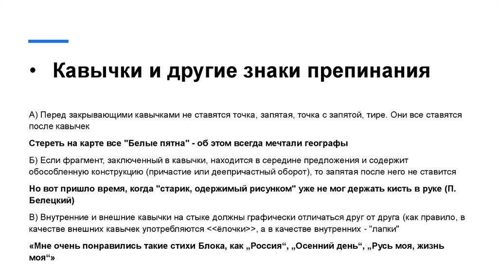 • Кавычки и другие знаки препинанияА) Перед закрывающими кавычками не ставятся точка, запятая, точка с запятой, тире. Они все ставятся